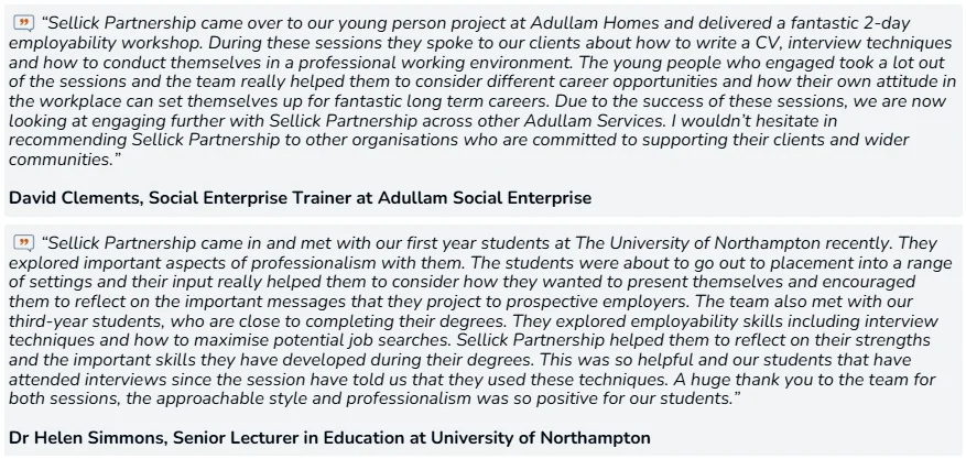 Our engagement in social value initiatives continued through various partnerships and employability workshops throughout 2025. Previously, we partnered with Northampton University and Adullam Housing, and most recently partnered with long-standing client, Spring Housing Association to host social value workshops and sales training sessions. Often, these workshops are tailored to the target audience, and often include content covering CV and interview tips and advice, networking and how to make/build connections, how to use LinkedIn to find your next move, what to expect in your first job and information around what hiring managers look for in an employee. Each workshop is tailored to their service users meaning our team are able to bespoke the content throughout each session to be focused on what was important to each individual client and the needs of attending delegates. Below is some fantastic feedback we have received from our charity partners: